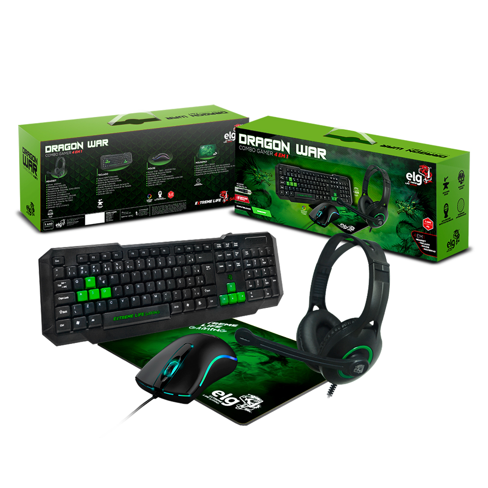 Prepare-se para a batalha com o Kit Gamer Dragon War 4 em 1 da ELG. Este combo completo, com detalhes em verde vibrante, foi montado para oferecer tudo que você precisa para uma imersão total e máxima performance em seus jogos, desde o primeiro clique.