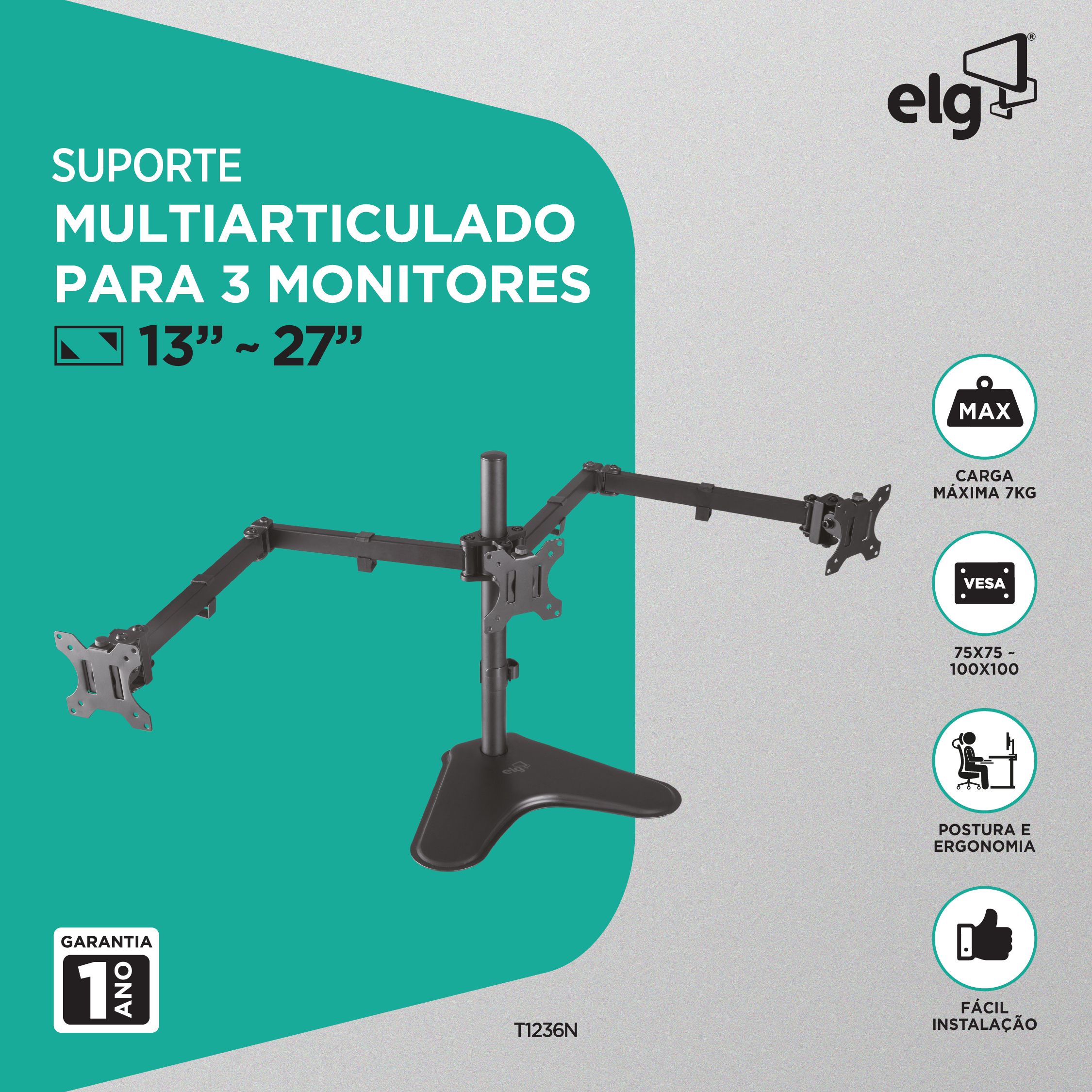 O Suporte de Mesa para 3 Monitores ELG T1236N é a solução ideal para quem precisa de performance, organização e ergonomia em alto nível. Perfeito para traders, desenvolvedores, designers, analistas e gamers, permite utilizar 3 monitores de 13" a 27" simultaneamente, com total estabilidade.