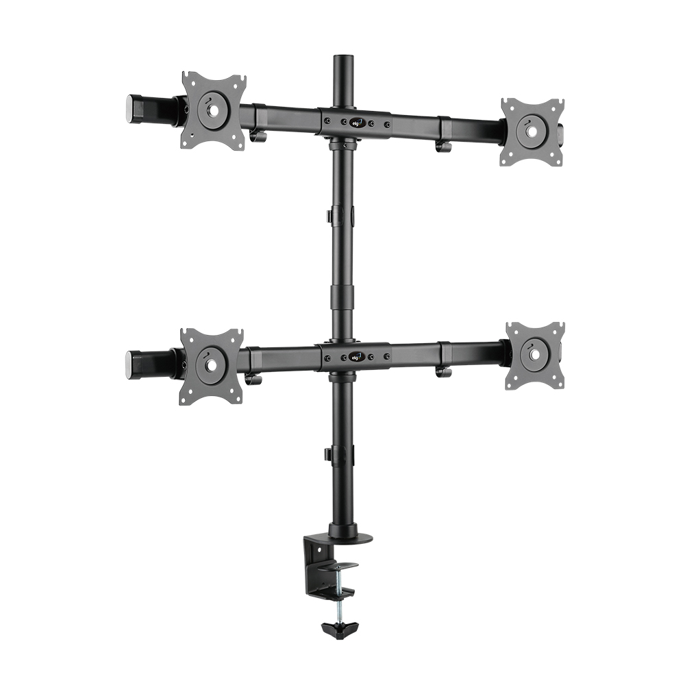 Com capacidade para até 8kg por tela e compatível com padrão VESA 75x75 e 100x100 mm, sua estrutura é produzida em aço carbono reforçado com pintura epóxi, garantindo robustez e durabilidade. Este suporte para 4 monitores possui certificação de ergonomia (NR17). Aproveite a total flexibilidade de movimentos com inclinação vertical (+45°/-45°), giro lateral (+15°/-15°) e rotação de 360° para posicionar as telas nos modos retrato ou paisagem. A instalação é versátil, podendo ser feita via morsa na borda da mesa ou através de um furo na superfície.