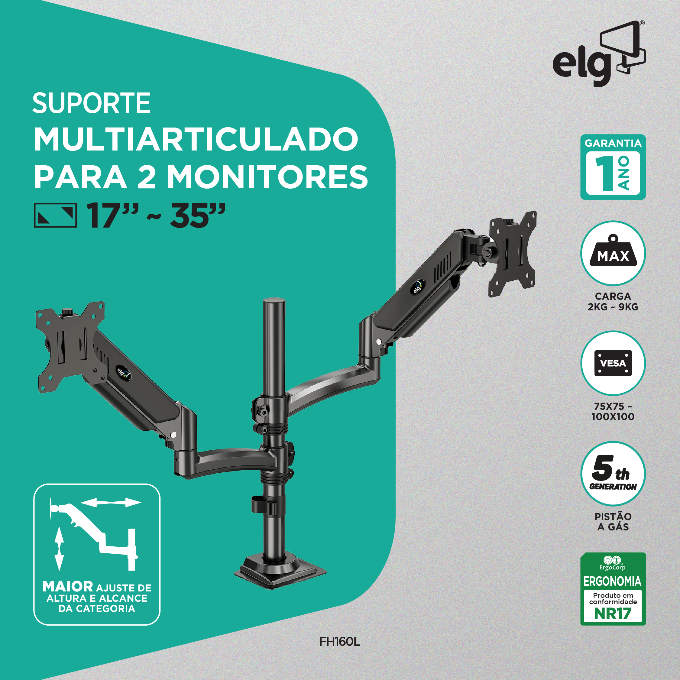 O suporte articulado de mesa FH160L da ELG eleva sua experiência com dois monitores, oferecendo máxima flexibilidade e organização. Ideal para profissionais e gamers que buscam precisão, ele é compatível com 2 monitores de 17" a 35".